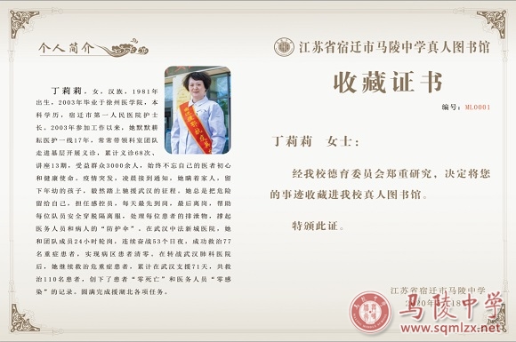 “援鄂英雄用行动诠释担当,用生命践行誓言。丁莉莉用援鄂‘战场’上的所见所闻、所悟所感,为我校全体师生奉上一道‘精神大餐’。她的感人事迹,也是我校最好的德育素材。为此,我校决定将她的事迹收藏进我校真人图书馆,这也是我校开设真人图书馆后,收藏的第一例事迹。”校长王丽梅告诉记者,她希望全校师生向援鄂“最美逆行者”学习,厚植奉献和担当的家国情怀,奋发图强,珍惜时光,好好学习,努力成为合格的社会主义建设者和接班人。