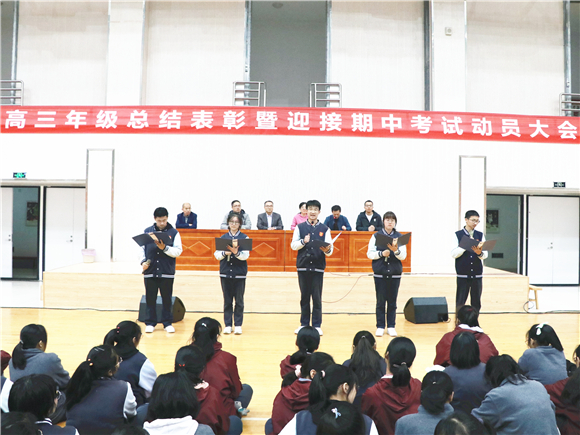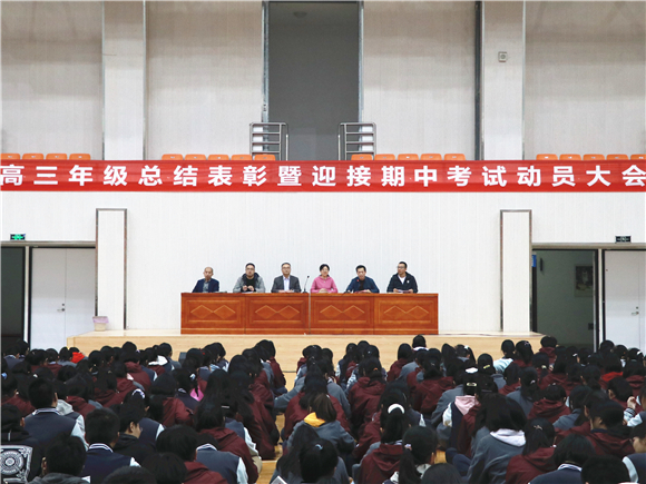 “荷尽已无擎雨盖,菊残犹有傲霜枝”,不知不觉间,高三的生活已过去近两月。为表彰先进,树立典型,激发斗志,明确目标,进一步调动高三年级学生的学习积极性,10月21日晚上,高三年级在体育馆召开了期初总结表彰暨期中考试动员大会,校长王丽梅、副校长汪德强、高三年级全体班主任及全体学生参加了会议。本次会议由高三年级二部主任李明主持,会议共有八项议程。