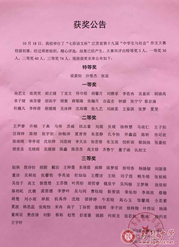 经过周密组织,精心评选,结果已经产生。大赛共评出特等奖3人,一等奖30人,二等奖40人,三等奖74人。现将获奖名单公布如下: