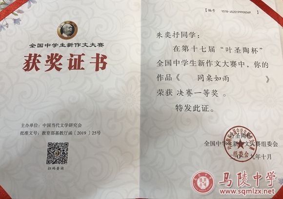 在第十七届“叶圣陶杯”全国中学生新作文大赛现场决赛中,我校高三(14)班朱奕抒同学获得全国一等奖,张梦雯老师荣获优秀指导教师一等奖,这也是近两我校在“叶圣陶杯”这项全国最高作文赛事中取得的最高奖项。颁奖典礼10月20日在泰州举行,朱奕抒同学及其指导老师张梦雯受组委会邀请,代表我校七位入围决赛的同学和六位指导老师参加了这次盛会。典礼上再传捷报:我校荣获优秀组织奖。