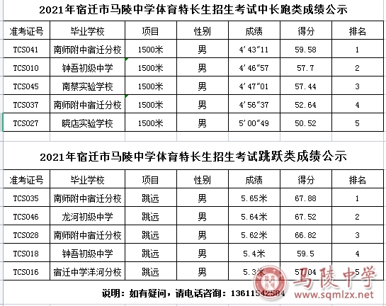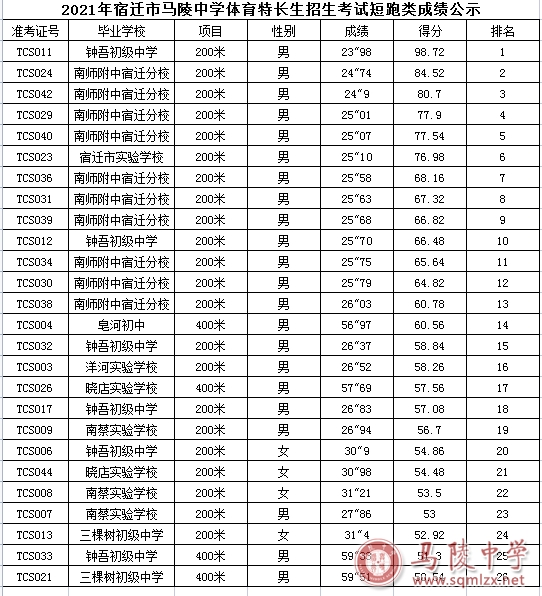 2021年宿迁市马陵中学体育特长生招生考试成绩公示