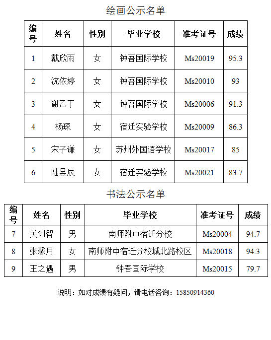 2020年马陵中学艺术特长生(美术类)招生考试成绩公示