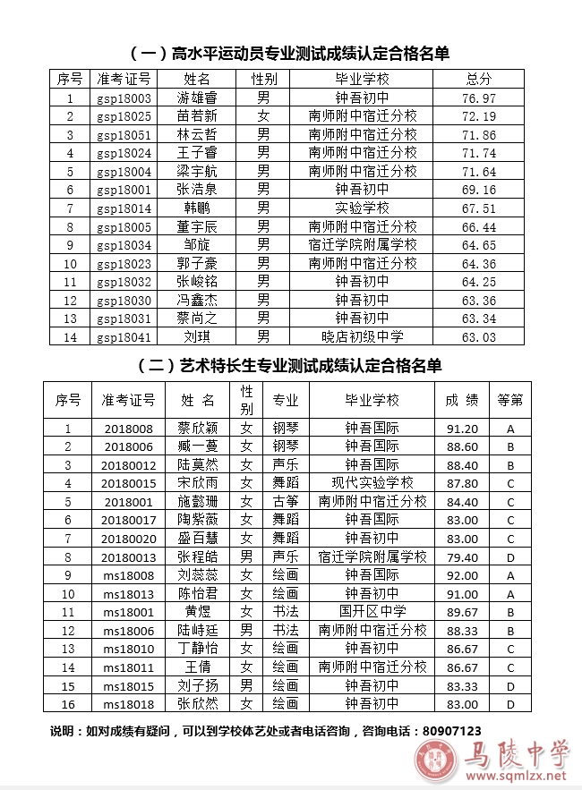 2018年马陵中学高水平运动员、艺术特长生招生考试成绩公示