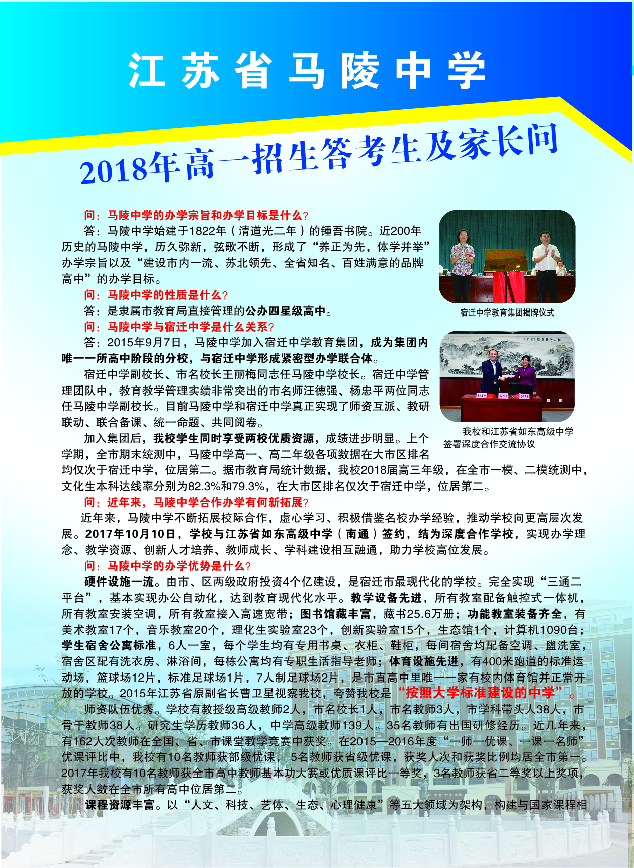 答:马陵中学将充分发挥是全市八所优生联盟学校成员校的办学优势,深入推进集团化办学,集中宿中和马陵中学优质师资,共同打造优生群体。同时加强对奥赛班、创新班、恒志班(宏志班)的管理和研究,根据学生个性特长,科学制定培养计划,为一流大学输送优秀学生,为国家培养创新拔尖人才。