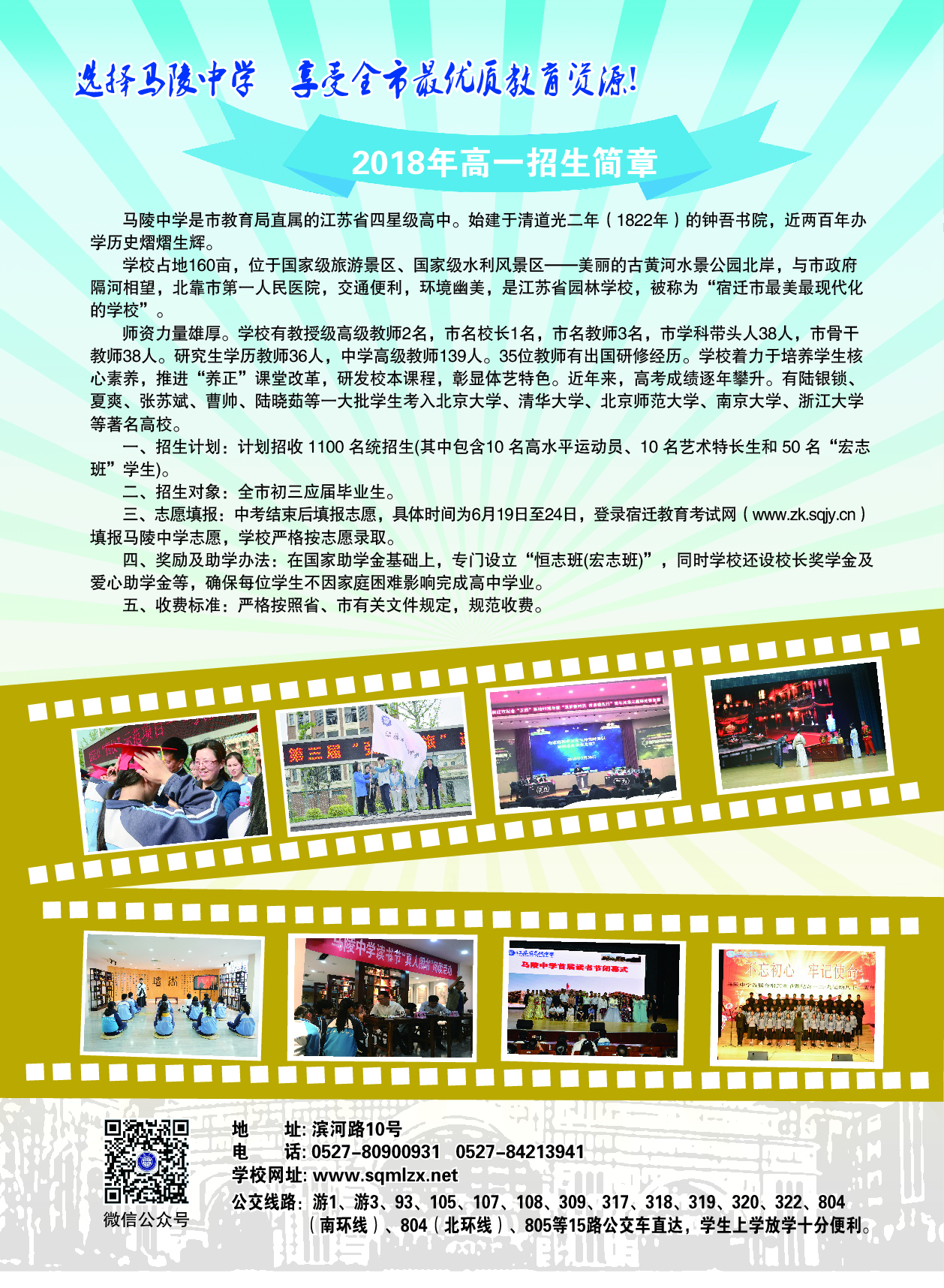 三、志愿填报:中考结束后填报志愿,具体时间为6月19日至24日,登录宿迁教育考试网(www.zk.sqjy.cn)填报马陵中学志愿,学校严格按志愿录取。