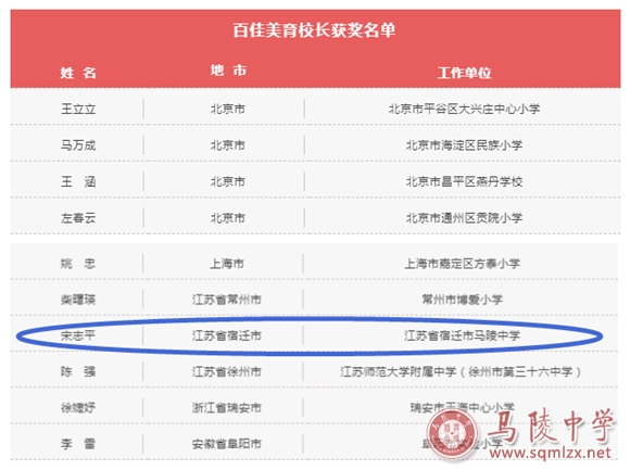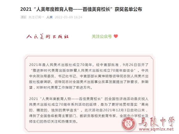 3月9日,2021“人美年度教育人物——百佳美育校长”获奖名单揭晓,马陵中学校长宋志平被评为全国“百佳美育校长”!