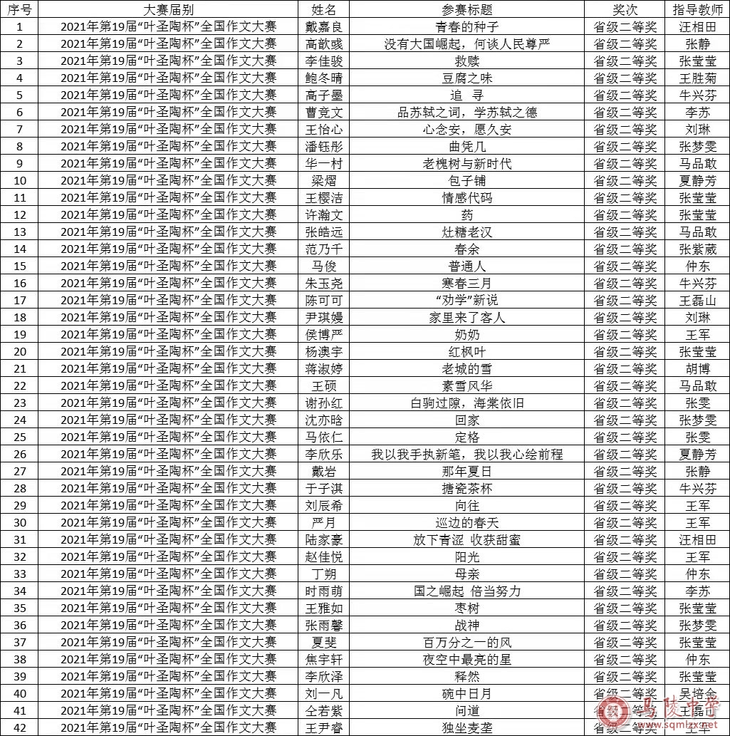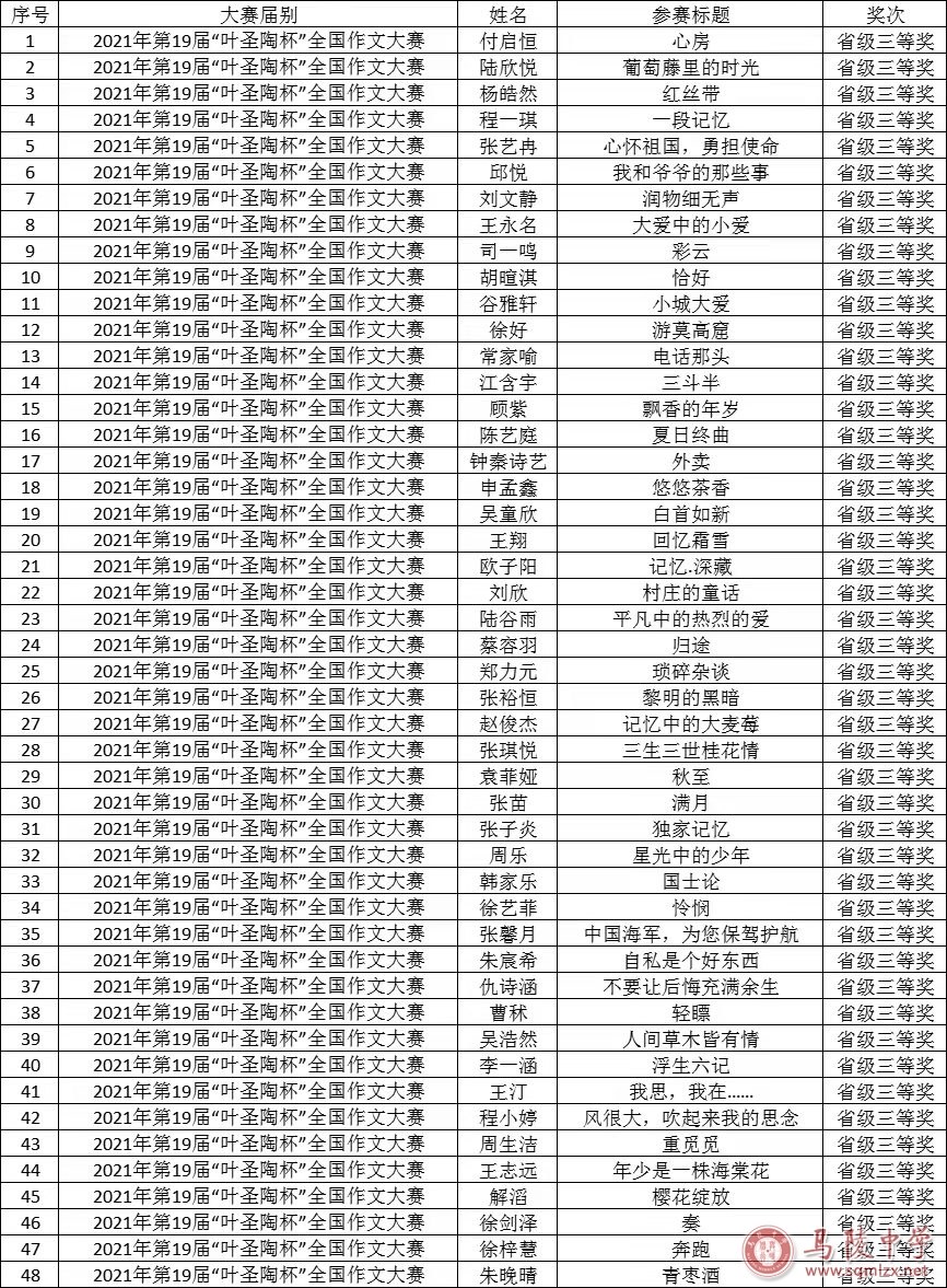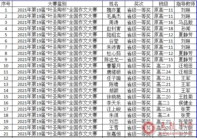 在课程处、年级处和语文组的精心组织下,在全体同学的积极参与下,在最近揭晓的2021年第19届“叶圣陶杯”全国作文大赛中,我校取得新突破,各奖项的获奖面均大幅提高,成绩非常优异!一等奖21人,2020年5人;二等奖42人,2020年15人;三等奖48人,2020年26人。