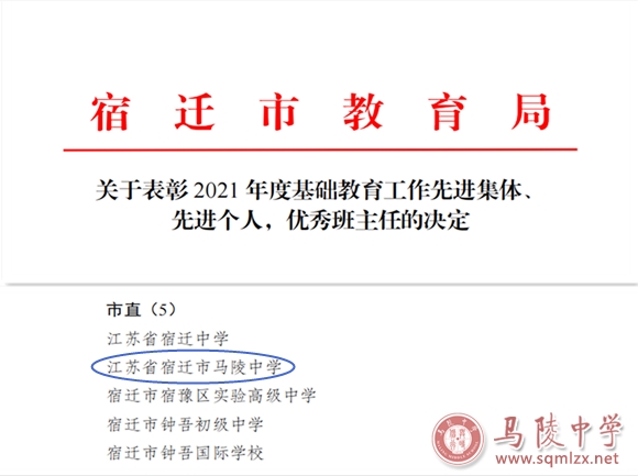 4月11日,马陵中学荣获宿迁市教育局颁发的“2021年度全市基础教育工作先进集体”荣誉称号,刘琳、李宝平同志荣获“2021年度全市基础教育工作先进个人”荣誉称号,马品敢、闫长娟、张道仓同志荣获“2021年度优秀班主任”荣誉称号。