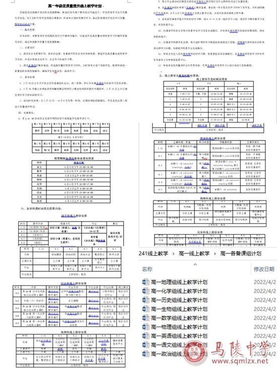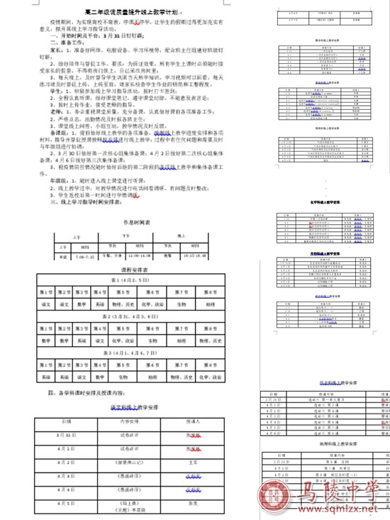 课程处牵头,各年级制定具体可行的、翔实具体的线上教学方案,包括作息时间表、课程表、线上集体备课安排、各学科进度安排、执教情况、早晚读课堂监督、作业监督反馈批改方式、辅导课安排、线上测试安排、教学资料意识形态把控,线上线下教学有效衔接等等。