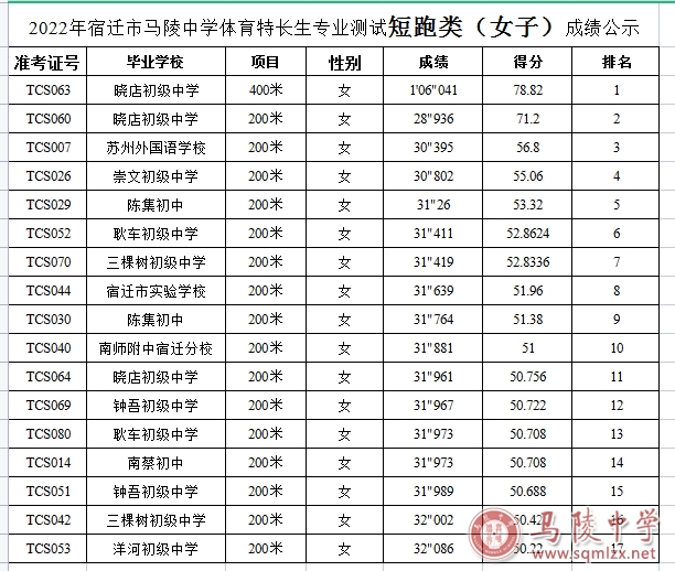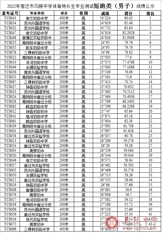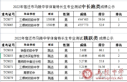 2022年宿迁市马陵中学体育特长生专业测试成绩公示