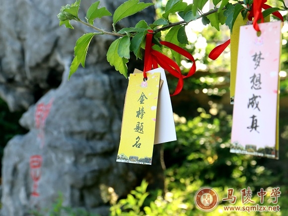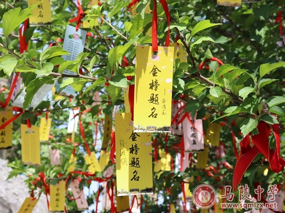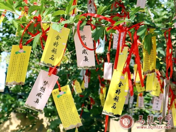 5月26日,一张张精心设计的高考祝福书签经由班主任,发放到每位高三学子手中。书签分为金、粉两色,一面印有“梦想成真”“金榜题名”字样,寄托对学生的美好祝愿;另一面则印着高考“三字经”,提醒学生高考期间的注意事项,字句朴实,朗朗上口。学生们在书签上写上姓名、心愿,用红色丝带系于“魁星”石旁树枝上,期待六月的美好收获。