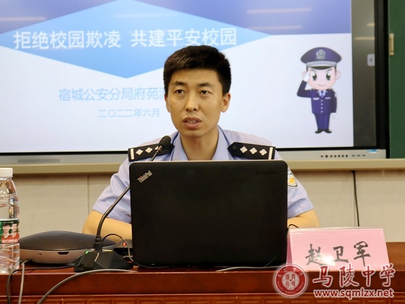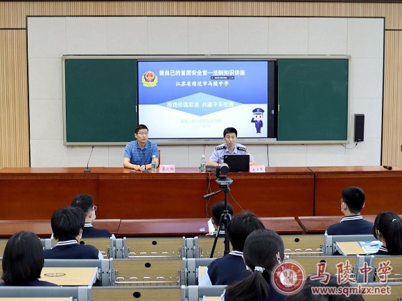 为进一步深化学校法治教育工作,提升学生的法律素养和守法意识,6月14日下午,我校邀请宿迁市公安局巡特警支队三大队副教导员赵卫军到校开设法治教育讲座。讲座由副校长蔡之刚主持。