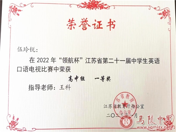 日前,”领航杯“江苏省第二十一届中学生英语口语电视比赛大赛结果公布,我校现高一15班伍玲锐同学荣获“高中组一等奖”奖项,英语学科中心教师王科荣获“优秀指导教师”称号。