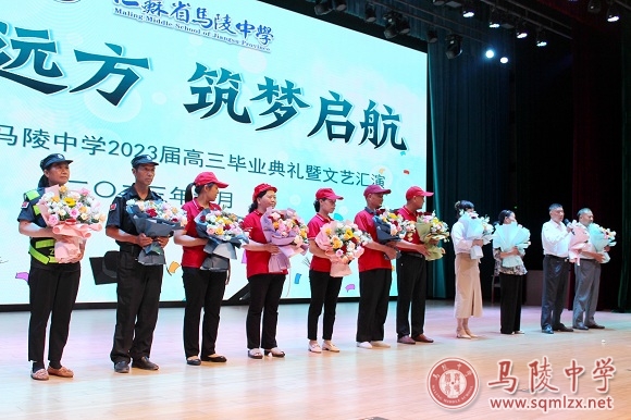 高三学习生活中,有一群默默付出的人们,保障着大家的吃、住、行。学生代表向宿舍管理员、食堂工作人员、学校保安献上鲜花,表达对每一位陪伴高三拼搏的后勤工作人员的诚挚感谢。