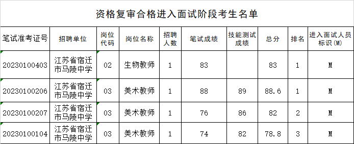 2023年江苏省宿迁市马陵中学(宿迁市教育局直属学校)面向社会公开招聘教师资格复审工作已经结束,现将资格复审合格进入面试阶段的考生名单及面试相关注意事项予以公布: