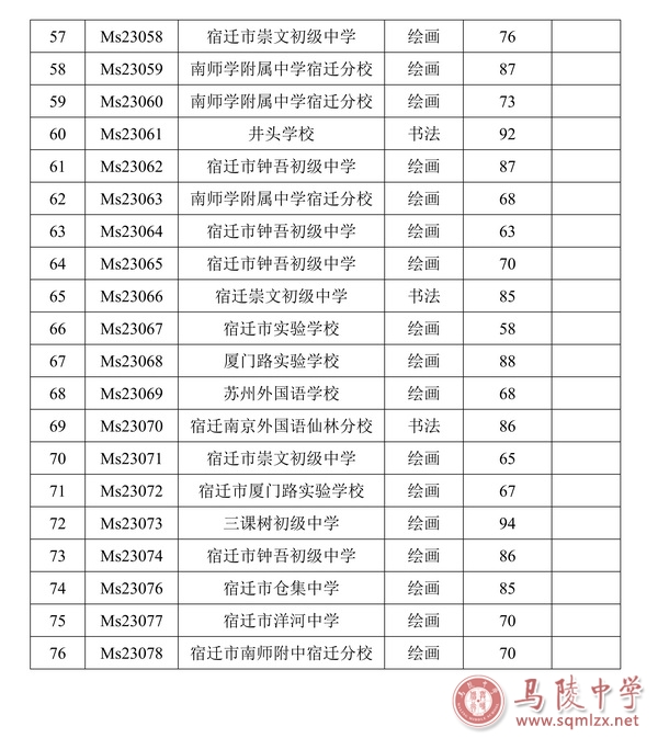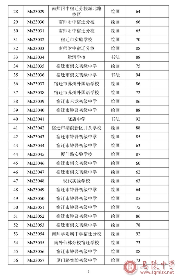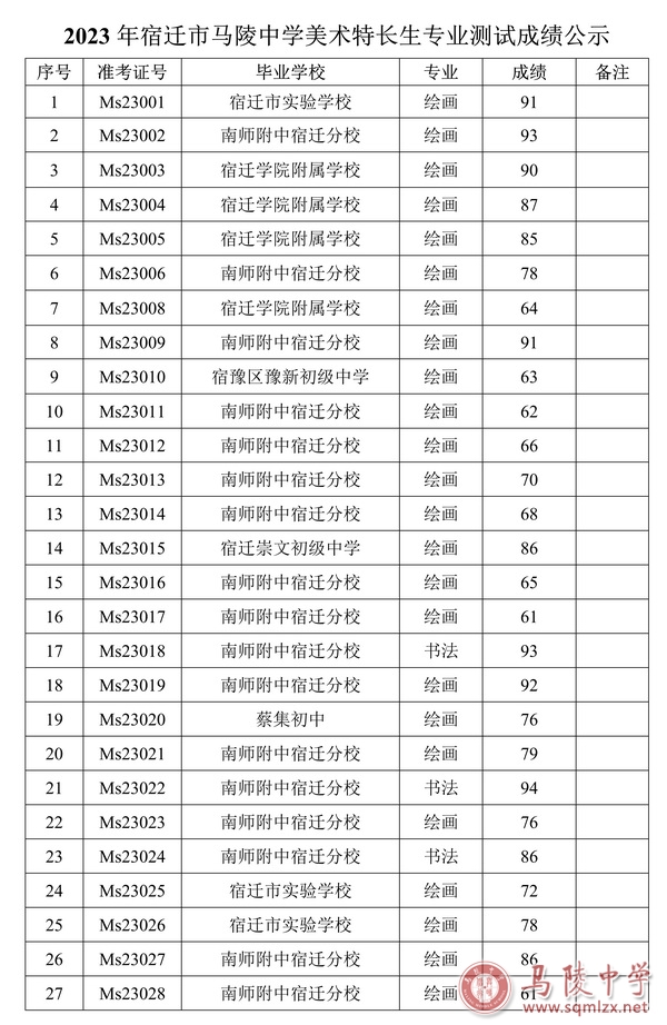 2023年宿迁市马陵中学美术特长生专业测试成绩公示