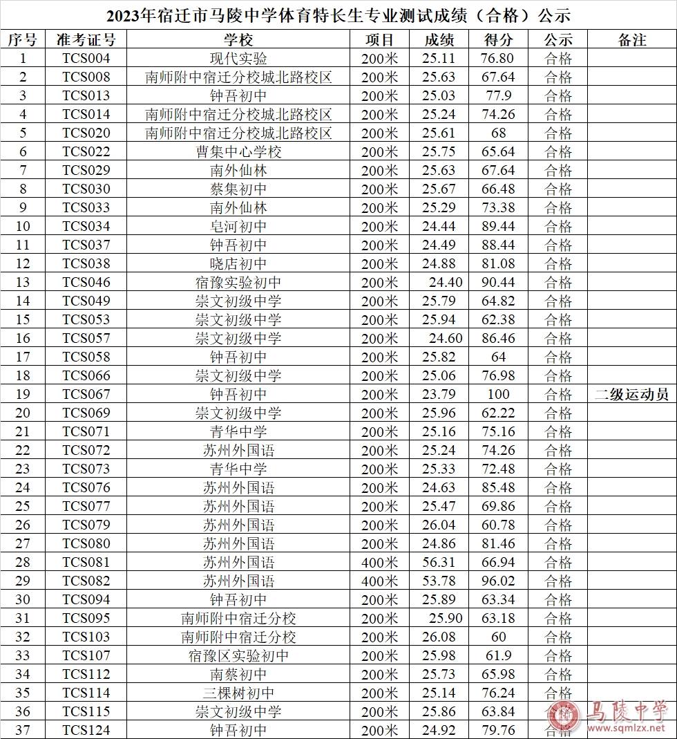 2023年宿迁市马陵中学体育特长生专业测试成绩公示