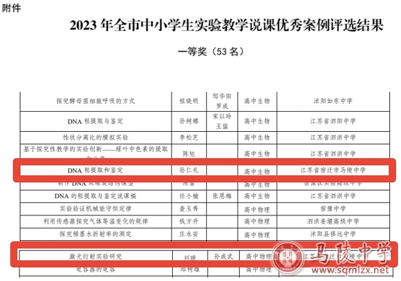 百舸争流千帆竞,教学相长奋者先。日前,2023年全市中小学实验教学说课优秀案例评选结果揭晓。我校生物组孙仁礼老师的案例《DNA 粗提取和鉴定》、物理组刘晴的案例《激光衍射实验研究》(团队成员孙成武)均荣获一等奖。