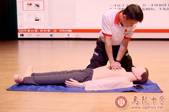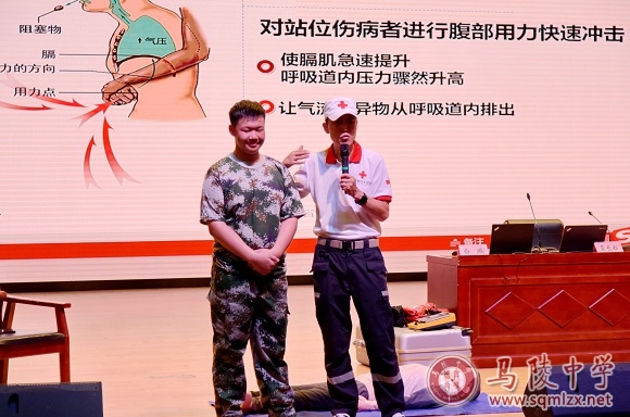 白鹏通过理论知识的讲解,结合实际操作分别讲解了心肺复苏与人工呼吸、海姆立克急救法、中暑、昏厥等方面的急救知识。为让同学们准确掌握技能,两位老师亲身示范,邀请同学上台操作,过程中细致地讲解急救技术要领。现场互动充分调动了同学们的热情,大家都沉浸在理论学习和实操演练中,了解并掌握自救互救的基本方法。