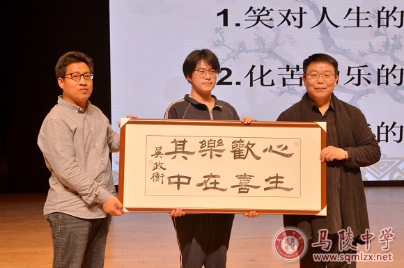 讲座结束后,高一年级学生吴政衡送上题字“心生欢喜,乐在其中”,表达对徐教授的深深的敬仰之情,并合影留念。