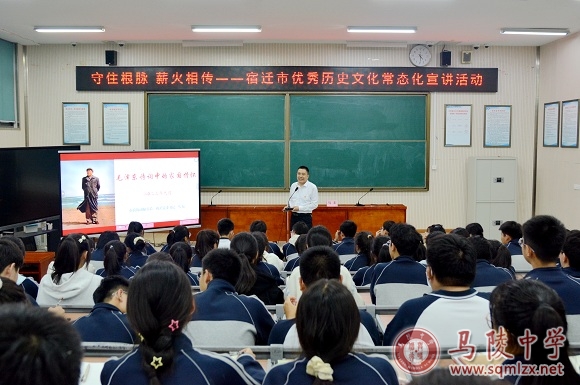 9月25日下午,一场别具一格的历史文化常态化宣讲活动在马陵中学成功举办。市政协副秘书长、机关党委书记马东为高一学生带来《毛泽东诗词中的家国情怀》主题讲座,在学生群体中普及毛泽东诗词的知识和魅力,带领学生感悟主席波澜壮阔的人生历程。此次活动由学生处主任龚长松主持。
