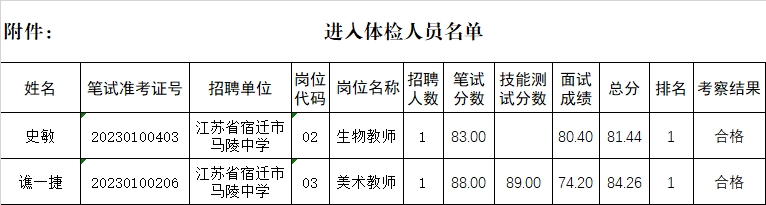 根据《2023年江苏省宿迁市马陵中学(宿迁市教育局直属学校)面向社会公开招聘教师公告》要求,现将考察合格进入体检阶段的考生名单予以公布。请进入体检阶段的考生按以下通知做好相关准备工作。