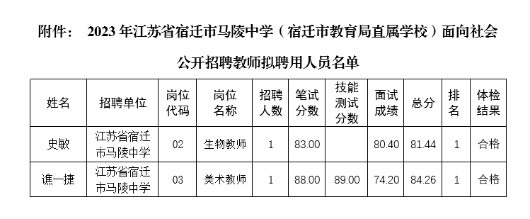 附件:2023年江苏省宿迁市马陵中学(宿迁市教育局直属学校)面向社会公开招聘教师拟聘用人员名单