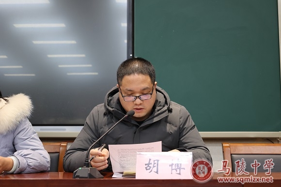 会议第一项议程:胡博对考试成绩做了全面细致的分析。他结合具体、详实的数据通报了一本、二本以及边缘生任务完成情况,表扬了各学科表现突出的班级,让所有教师看到自己所教班级在本次考试中的成绩与不足。强调各位老师必须深刻反省,严格落实教育教学常规,各学科要有重点、有导向的查漏补缺。