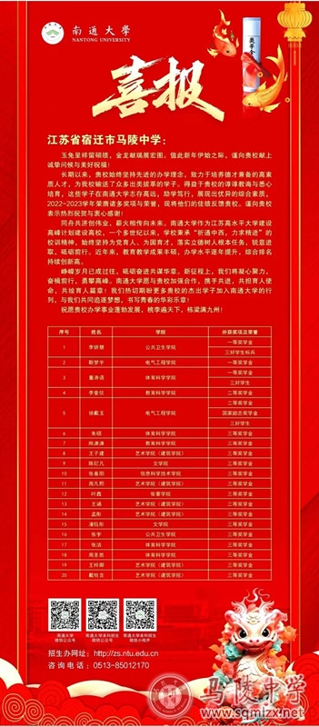 近日,我校收到来自南通大学的喜报。在南通大学2022-2023学年评奖评优中,我校优秀毕业生徐戴玉同学荣获国家励志奖学金及“三好学生”称号,李妍慧、靳梦宇、董涛语三位同学荣获一等奖学金,其中李妍慧同学被授予“三好学生标兵”称号,李奎仪、徐戴玉二位同学荣获二等奖学金,朱硕等十五位同学荣获三等奖学金。