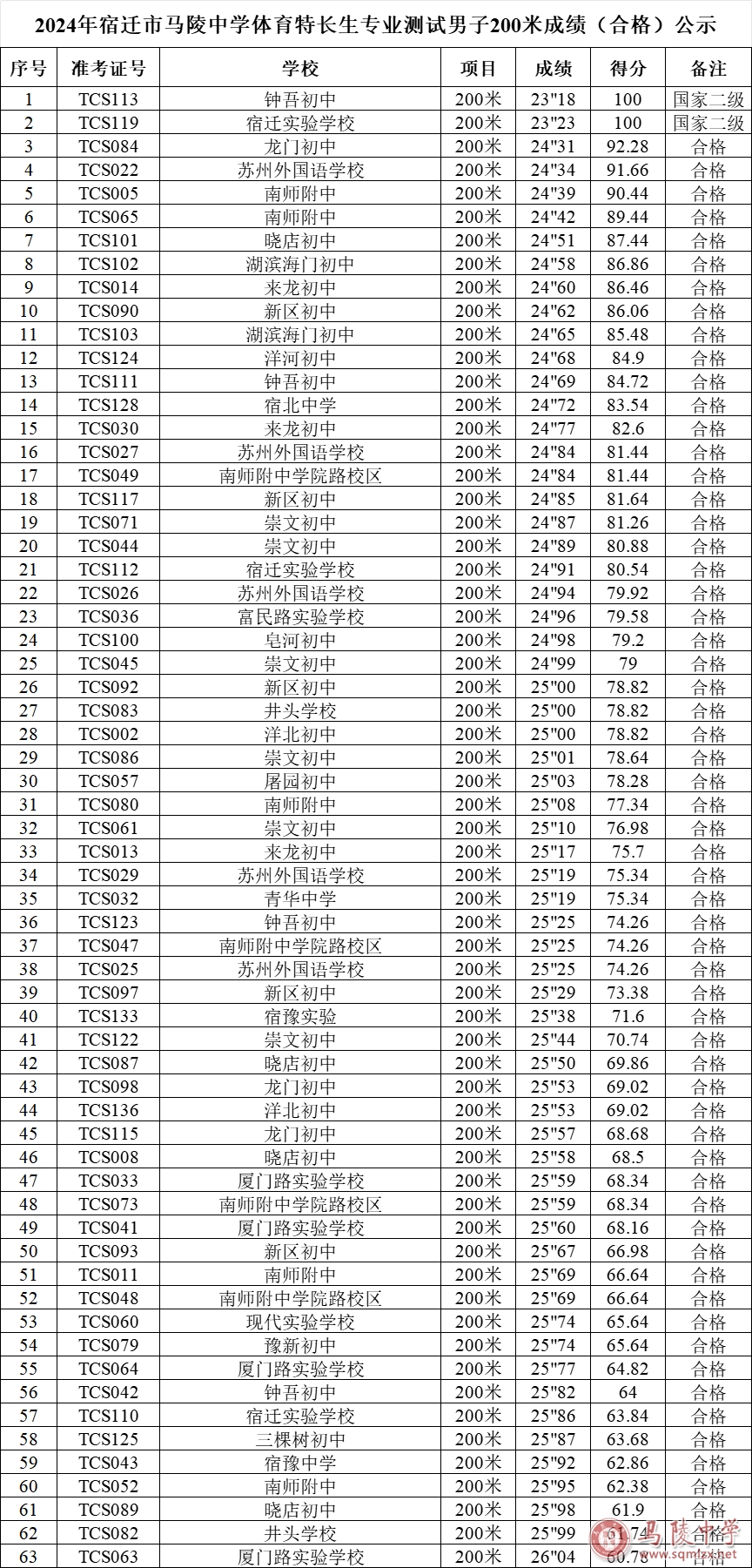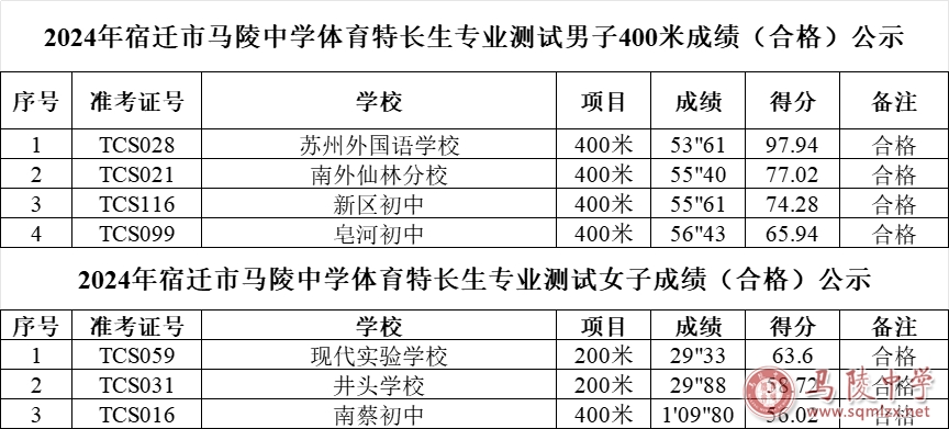 马陵中学丨2024年宿迁市马陵中学体育特长生专业测试成绩(合格)公示