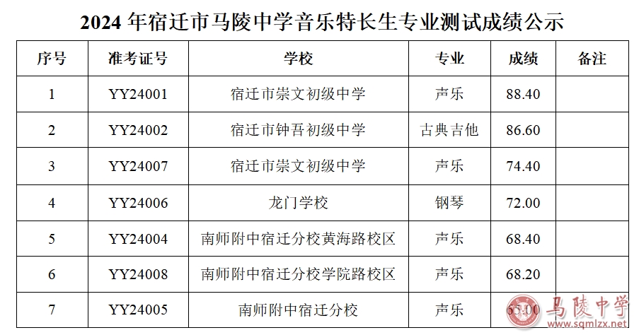 马陵中学丨2024年宿迁市马陵中学音乐特长生专业测试成绩公示