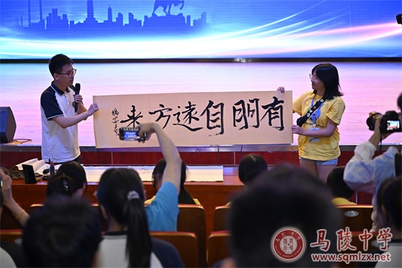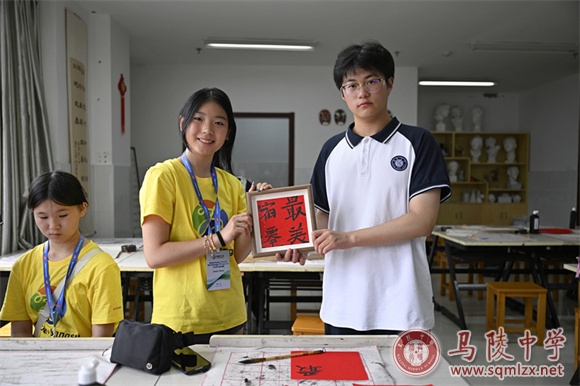 “呦呦鹿鸣,食野之苹。我有嘉宾,鼓瑟吹笙。”校合唱团轻唱《小雅•鹿鸣》,千年雅正之音,开启欢迎仪式,也拉开了文化交流的序幕。欢迎仪式在我校艺术楼报告厅隆重举行,由高二(15)班伍玲锐同学主持。热烈的互动中,学生代表们展示新疆舞蹈《花儿为什么这样红》、中文歌曲《青花瓷》、书法展示《有朋自远方来》等才艺。欢迎仪式上,苏俊宝代表马陵中学向美国朋友致以最热烈的欢迎,并和刘阳一起向交流营领队互赠纪念品。