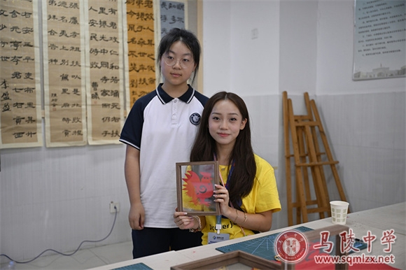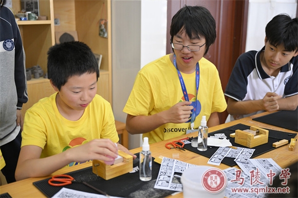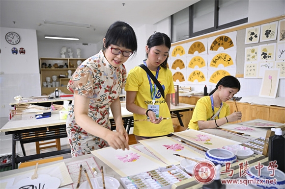 仪式结束后,营员们分组体验中华传统文化课,剪纸、陶瓷印篆刻、国画、书法。美术组王洋组长和仲晓娟、臧稳、谯一捷三位老师,及学生志愿者克服语言困难,悉心指导。营员们也表现了对中华传统文化的强烈兴趣和学习力。灵动祥瑞的剪纸,流畅美观的书法,古朴雅致的陶瓷印篆刻,清新淡雅的国画,一幅幅浸润中国古典文化的作品在美国孩子手中不断面世。营员们体会到中华文化的博大与悠远。中国的扇面尤为营员最爱,仲晓娟老师挥毫成韵,淡彩天成,博得国际友人连连赞叹,奉为最珍贵的礼物。