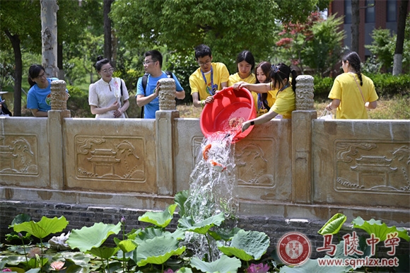 交流营一行还参观了我校儒家文化广场、“春华秋实”石刻、养正石、正气亭等处,现场感受到我校深厚的历史底蕴。在孔子广场,孩子们兴致勃勃地参加了放生锦鲤和鱼跃龙门仪式,感受东方文化的神韵。