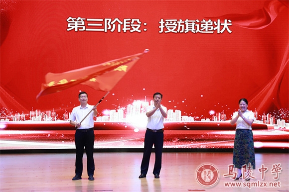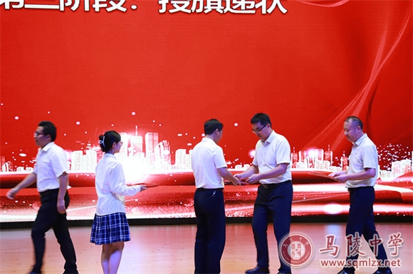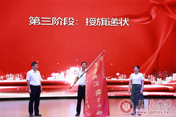 红旗招展,决胜未来。2024届高三年级分管领导、工会主席袁金花向党委书记、校长宋志平呈旗。党委书记、校长宋志平向2025届高三年级分管领导、副校长蔡之刚授旗。