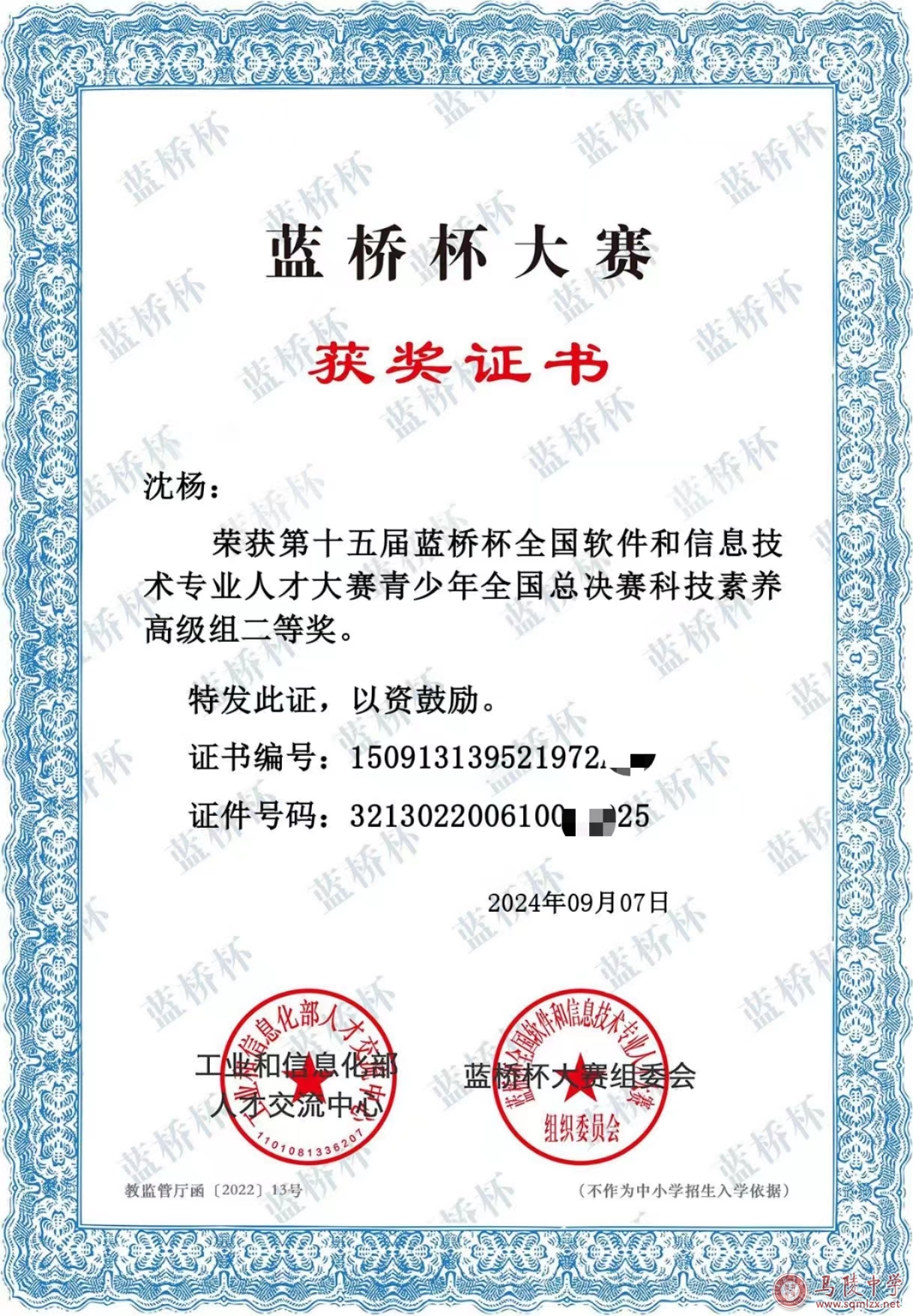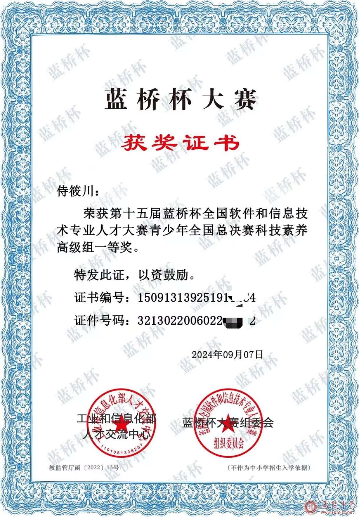 近日,第十五届“蓝桥杯全国软件和信息技术专业人才大赛”大赛青少组全国总决赛成绩揭晓。马陵中学侍筱川同学勇夺全国一等奖,田妍和沈杨两位同学荣夺全国二等奖。指导教师梅海莲。