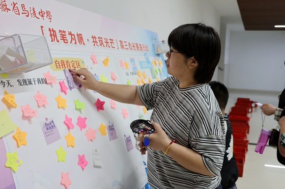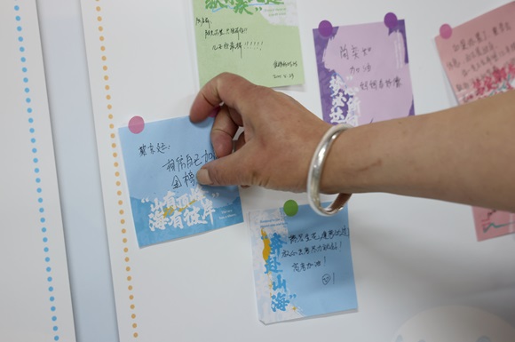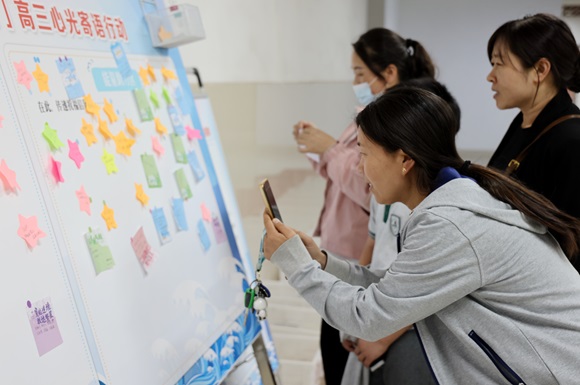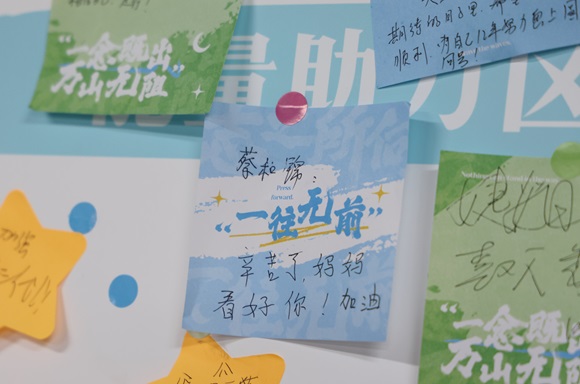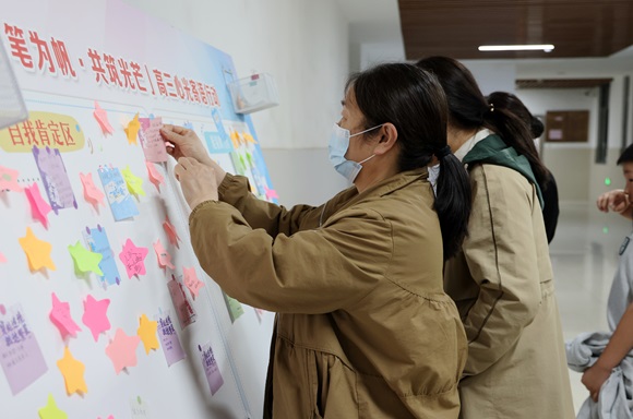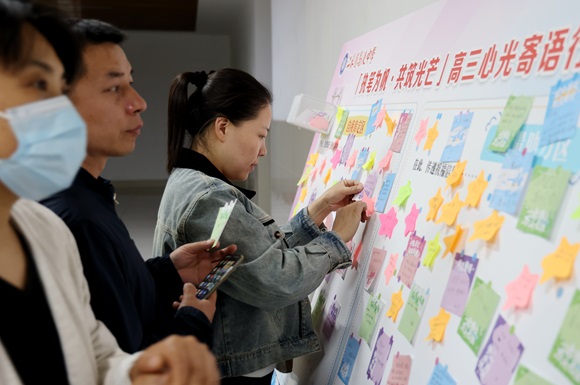 讲座尾声,一场温情的互动环节将活动气氛再次推向高潮。家长们纷纷在便签上写下对孩子的鼓励与祝福——“相信自己,爸妈看好你!”“放轻松,你一定行!”“宝贝你真的很棒,你永远是爸爸妈妈心中的小太阳。”——这些承载着爱与期盼的文字被逐一贴到高三教学区的展板上,形成一片“能量助力墙”。展板前,不少家长驻足良久,有的轻声诵读他人寄语,有的拍照记录这份特殊的礼物。一位母亲红着眼眶说:“平时不敢当面说的话,写下来反而更真挚。希望孩子走过这里时,能感受到全家的支持。”