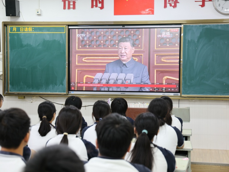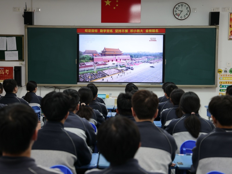 庄严肃穆却又欢欣振奋的氛围弥漫在校园中。全校上下高度重视,领导班子全体成员齐聚会议室观看大阅兵直播,各年级积极响应,提前对教学安排进行了细致入微的调整,上午9点,在各班班主任的悉心组织与引导下,学生们身着整洁的校服,端坐在座位上,目光中闪烁着期待与敬仰,以最饱满的精神状态迎接这一历史性的时刻。