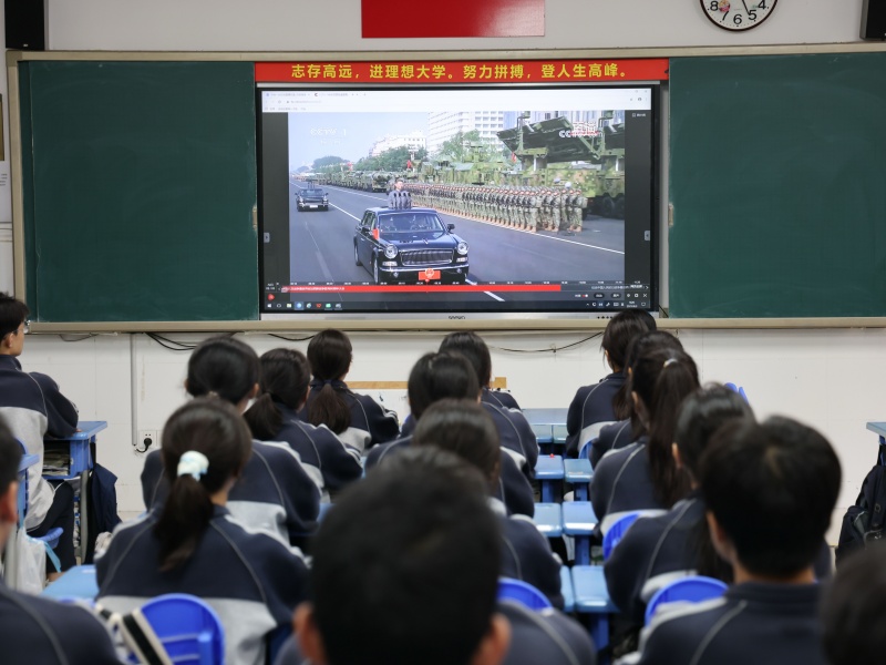在观看的过程中,班主任们巧妙引导,鼓励学生们深入挖掘大阅兵背后的历史意蕴与时代内涵。学生们为军人们那整齐划一的动作欢呼,更为那些老兵们坚毅的面容动容;不断展出的各式新型武器点燃了大家心中的激情,最后天安门广场放飞的和平鸽又将“和平”的终极愿景刻在每一位学子的心中。