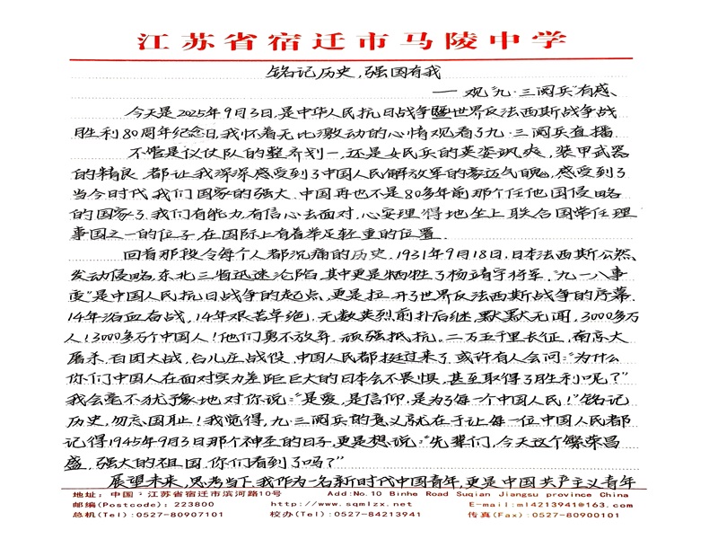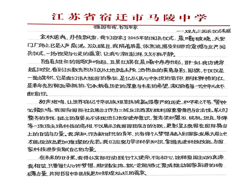 此次观看抗战胜利80周年大阅兵活动,不仅让马陵中学的师生们重温了那段波澜壮阔、英勇抗争的历史岁月,更激发了所有人的爱国热情与时代担当精神。相信在未来的日子里,全体师生将以更加昂扬的斗志、更加坚定的信念,投身到学习和工作中去,用智慧和汗水书写属于新时代的辉煌篇章。