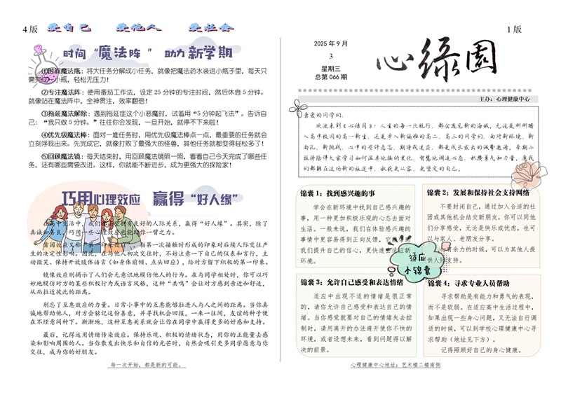 此外,本次会议上还发放了新印发的《心绿园》心理报。该报纸作为心理健康教育的重要载体,与心理助理员的工作紧密相连,既提供心理健康知识,也为同学们提供表达与交流的平台。心理助理员可借助报纸内容,更好地在班级中开展心理健康宣传与科普工作。