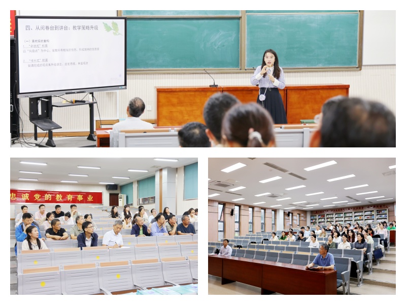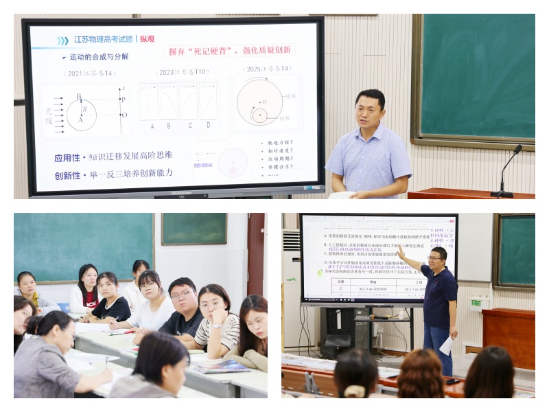 随后,我校特邀宿迁中学参加2025年高考阅卷工作的四位教师——语文张静宁老师、数学黄金晶老师、外语许曈彤老师、化学吴凯旋老师,分学科作高考阅卷心得专题分享。四位老师结合自身阅卷经历,从“评分标准解读、典型答题案例、常见失分原因、教学改进建议”四个维度展开详细讲解:张静宁老师通过展示高考语文作文与现代文阅读的典型答题案例,强调“审题精准性”与“表达逻辑性”对得分的关键影响;黄金晶老师结合数学阅卷评分细则,指出学生在“步骤完整性”“公式规范书写”方面的常见问题,并提出“分层训练+错题归因”的教学建议;许曈彤老师针对高考英语书面表达与阅读理解题型,分享了“语篇语境分析”“语言运用准确性”的提升策略;吴凯旋老师则围绕化学实验题与计算题的阅卷情况,强调“实验原理理解”“数据处理规范性”的重要性。每场分享时长约20分钟,内容兼具专业性与实用性,既有对阅卷细节的精准解读,也有对教学实践的具体指导,让在场教师深刻认识到“从阅卷视角反推教学改进”的重要意义。