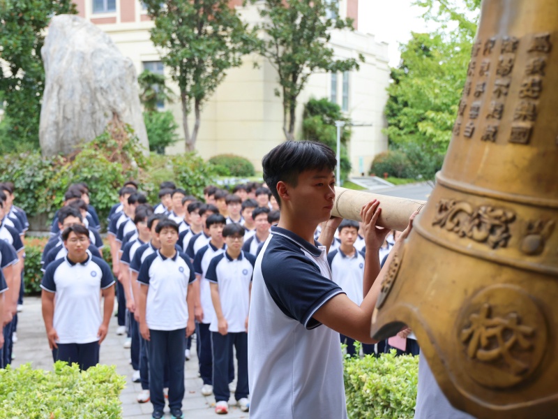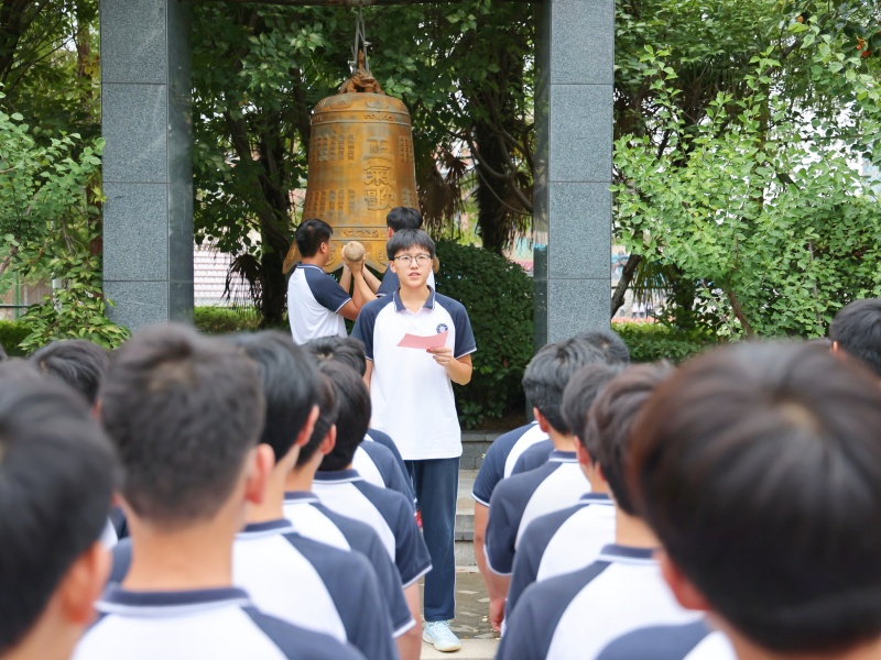 随后,同学们来到养正楼后正气钟处举行了撞钟鸣警仪式。两名学生代表上前,大力撞响“警世钟”。14响钟声回荡在校园上空,代表着中华民族14年抗战的艰辛历程,这钟声同样回荡在每一位同学的心中,与鼓荡振动的一颗颗红心共鸣。“青春筑梦,肩负重担!不负时代,不负人民!”的铮铮誓言宣告着此刻每一位同学的心声。
