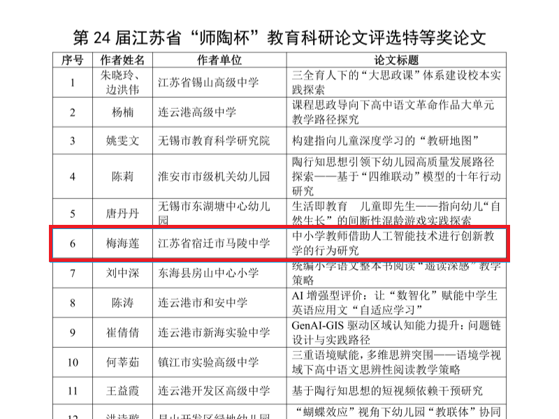 9月24日,第24届江苏省“师陶杯”教育科研论文评选结果揭晓,马陵中学教师在激烈的竞争中脱颖而出,斩获两项重要奖项。梅海莲老师的论文《中小学教师借助人工智能技术进行创新教学的行为研究》荣获特等奖,张静老师的论文《分析型评价量表:逆向设计原则下的史传文思辨性阅读支架——以〈屈原列传〉〈苏武传〉联读为例》荣获一等奖。