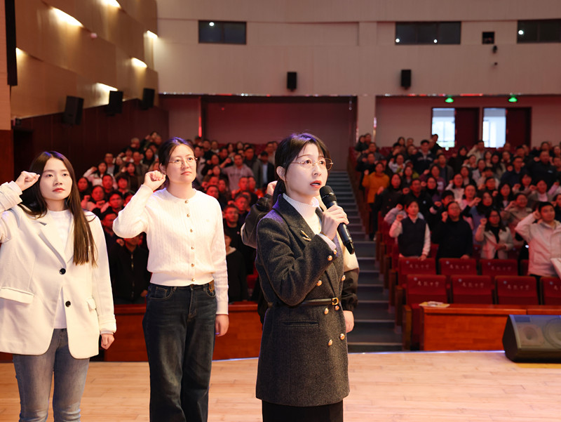 一份誓言,一份承诺。党委委员刘琳带领三位新教师庄严宣誓。全体教职工共同肃立,重温誓词。
