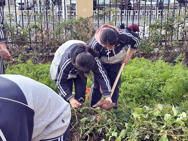 讲话结束后,在施猛老师与郝蕴老师的带领下,学生们以小组为单位迅速投入收获工作。田间地头顿时一片忙碌,同学们手持工具小心翼翼地挖掘,当带着泥土清香的饱满红薯被逐一挖出时,现场不时响起阵阵欢呼。大家一边劳作,一边不忘践行“做中学”的理念,认真观察红薯块根与侧根的连接方式、表面细微结构,并不时与同伴交流所学知识,有的小组还拿出卷尺和记录本,仔细测量红薯重量、统计块根数量,为后续实践报告积累第一手素材。