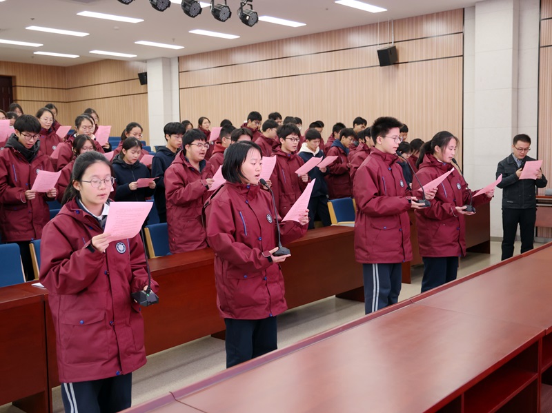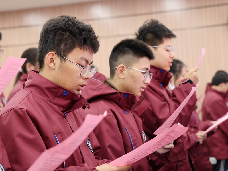 活动高潮是全体师生共同参与的“宪法晨读”集体诵读环节。在领读人程欣然、刘妍希、邱楚航、陆香含的带领下,全场肃立,齐声朗读宪法选段。铿锵有力的诵读声,不仅传递出对宪法的尊崇,也展现了新时代高中生弘扬法治精神、立志成才报国的精神风貌。宪法条文在朗朗诵读中化作青春的誓言,深深烙印在每位同学的心中。