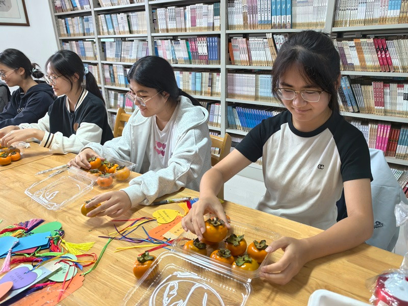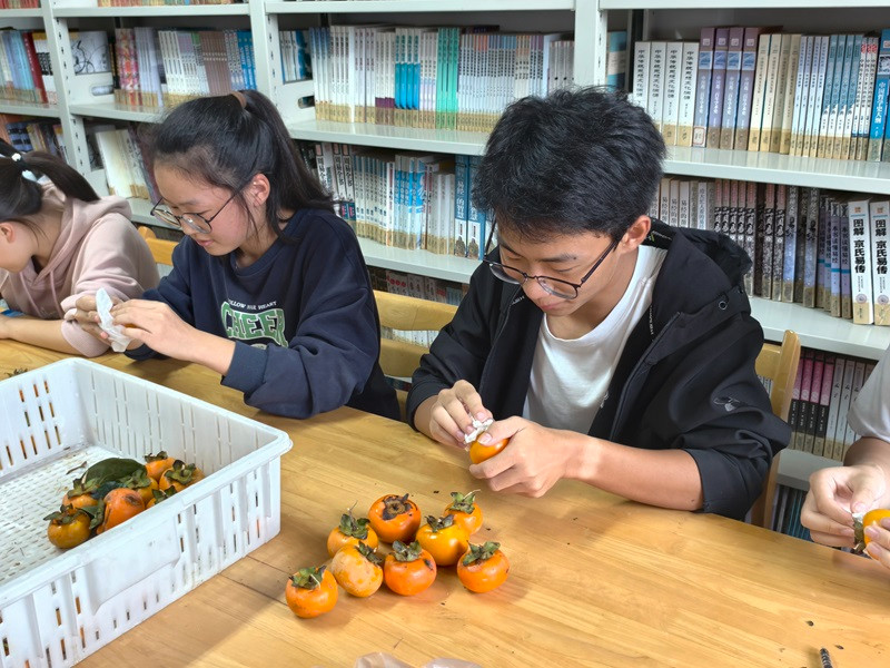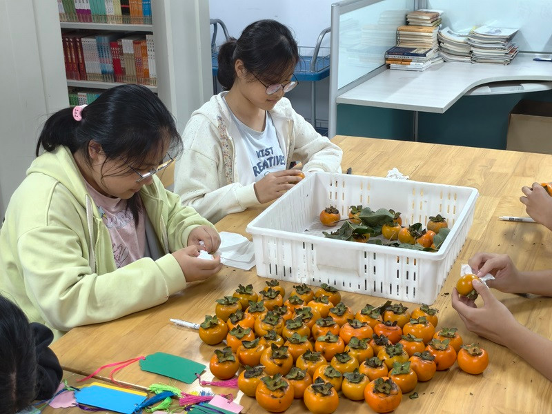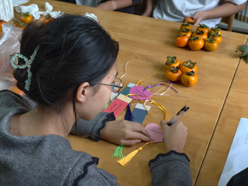 采摘结束后,同学们将果实集中到阴凉处,细心进行分拣,挑选出饱满完好的柿子,用纸巾轻轻擦拭。随后,大家动手将柿子整齐装盒、细心包装,并在精美的卡片上一笔一画写下真挚的祝福: