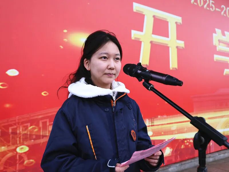 学生代表、高三 23 班胡玉辰同学分享了观看冬奥会后的感悟,讲述了如何将热爱转化为实际行动,在坚持与拼搏中不断探索、实现成长的思考。她期待同学们在新学期里,以“健康赋能、勤学笃行、活泼求真”为行动指南,勉励高一高二学弟学妹夯实基础、永葆好奇,并与高三伙伴共勉,在最后的冲刺阶段彼此照亮,全力以赴。