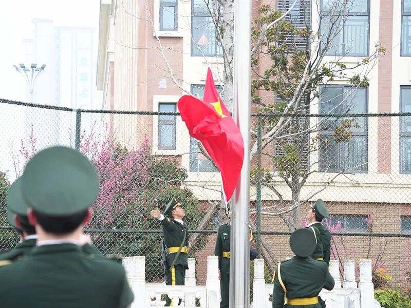 开学典礼在庄严的升国旗仪式中拉开帷幕,国旗护卫队步伐坚定,全体师生肃立注目,伴随着雄壮的中华人民共和国国歌,五星红旗冉冉升起。